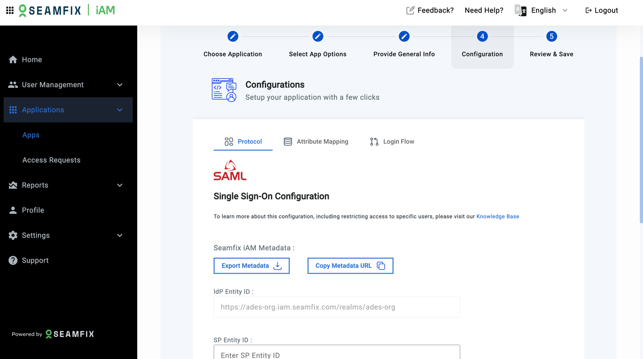 - SAML: Add the applicationās SAML configuration, including metadata URL, Entity ID, and SSO URL.