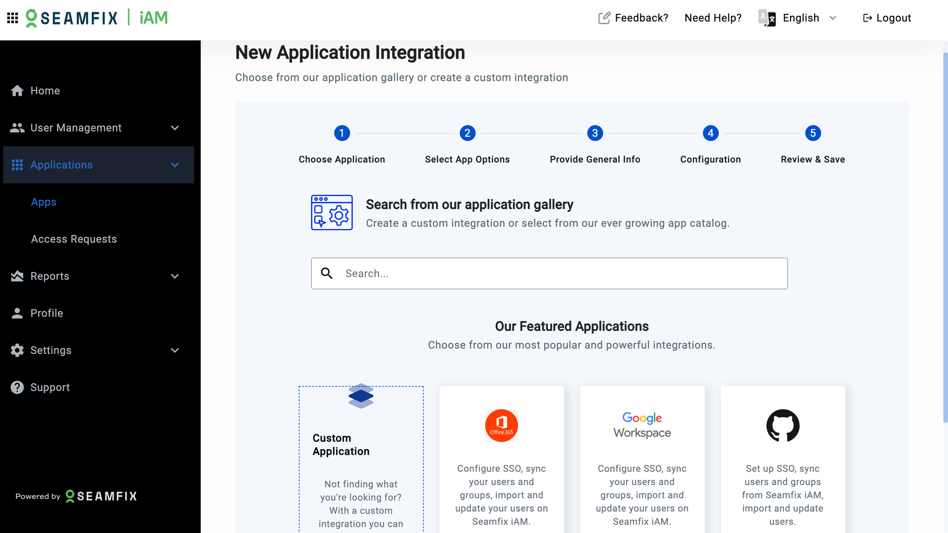 - Choose the Application Type: If the application is available in the pre-integrated app catalog, select it to proceed with simplified configuration. If not, choose Custom Application to configure it manually.