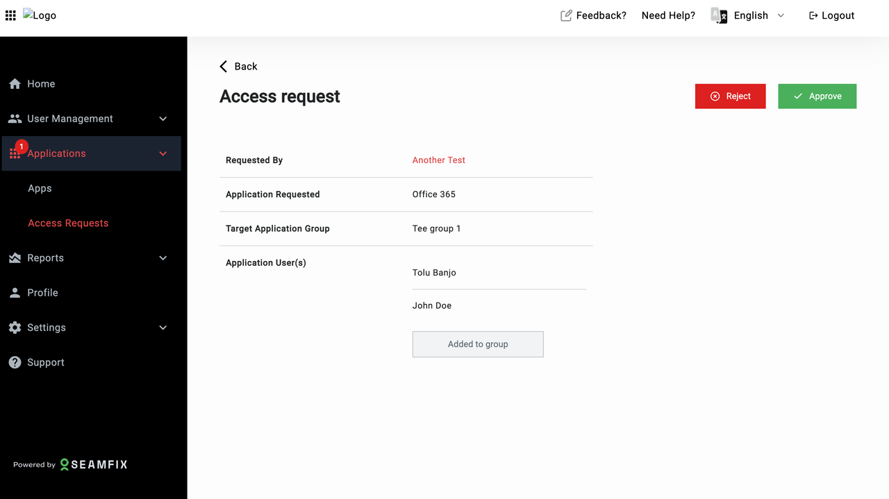 - Approve: Grant the user access to the application. The user will be automatically notified of the approval.