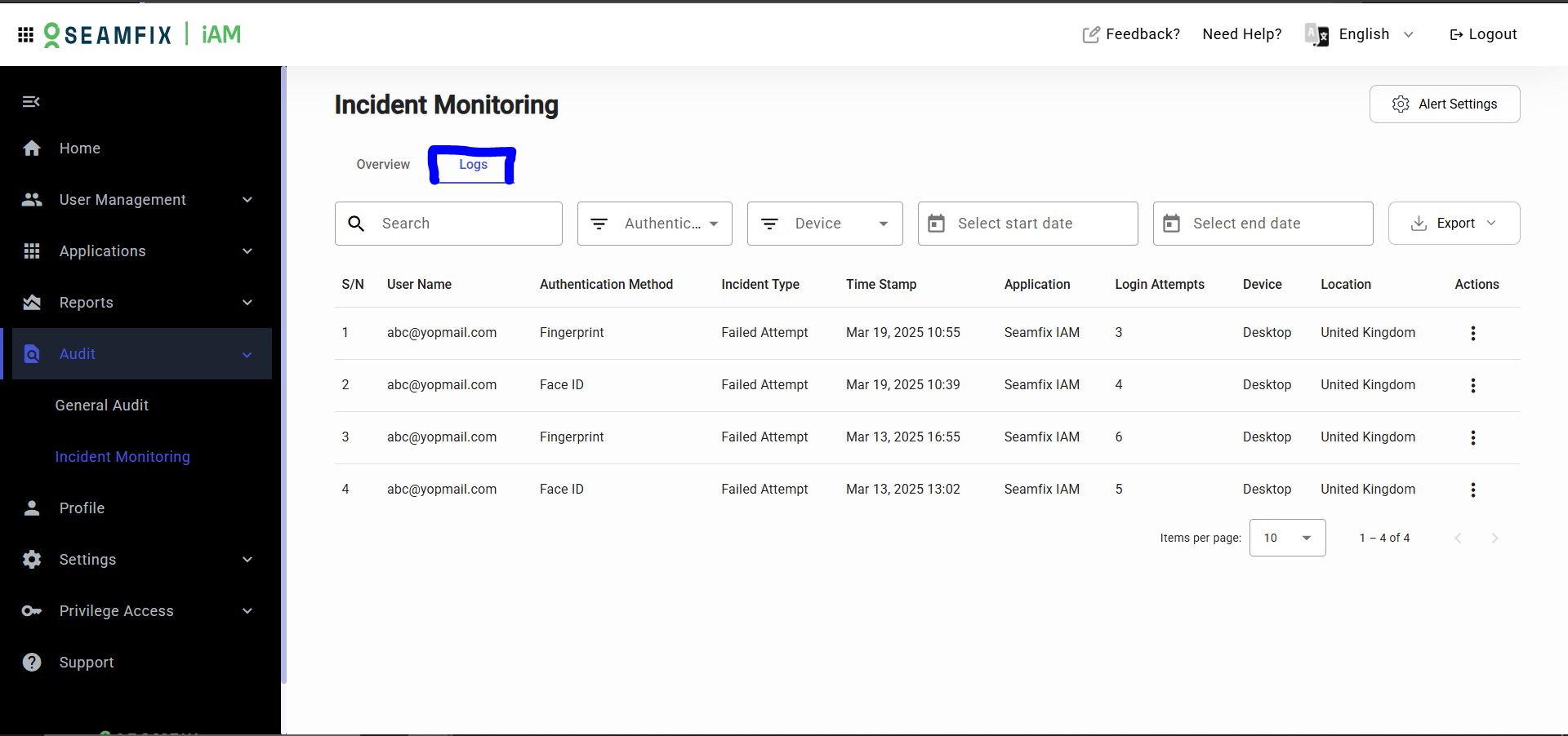 - Beside the overview tab is the logs tab that shows the incident table with incidents listed in chronological order.
