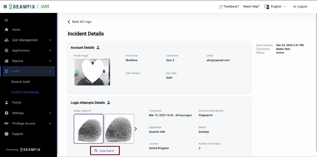 - Here, you will find in-depth information such as logs, affected user, details of the location, biometric type and biometric details of the person that made the attempt
