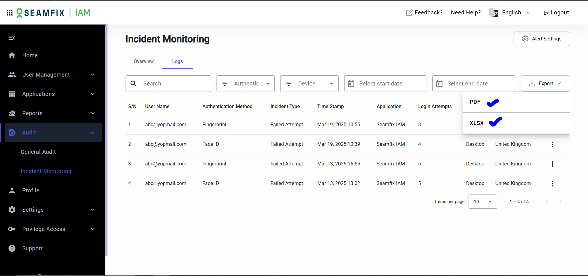- Use the filter options at the top of the page to narrow down incidents by parameters such as date, device, biometric type.