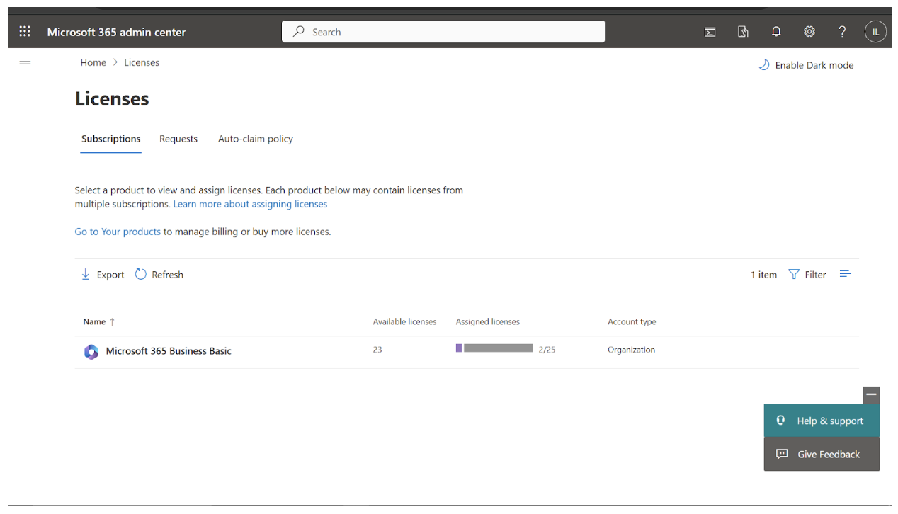 Go to the Microsoft Admin Portal Licenses Page