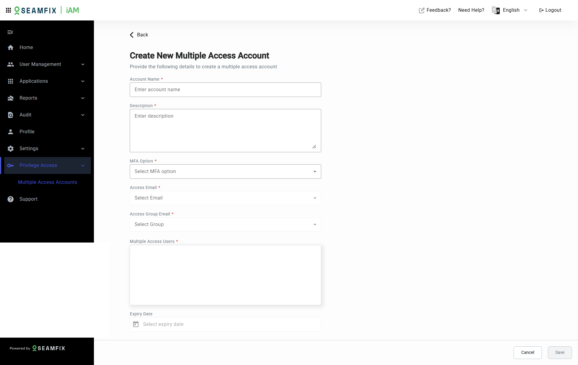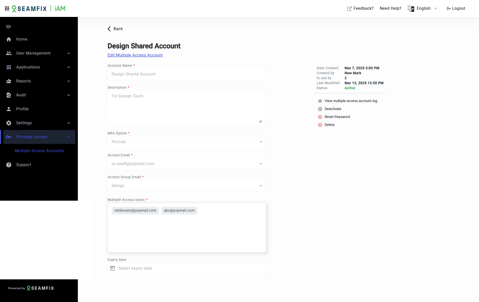 - Expiry Date: Select the expiry date of the Multi Access set-up. On this date, the multiple access users will cease to be able to access resources using the Access Account