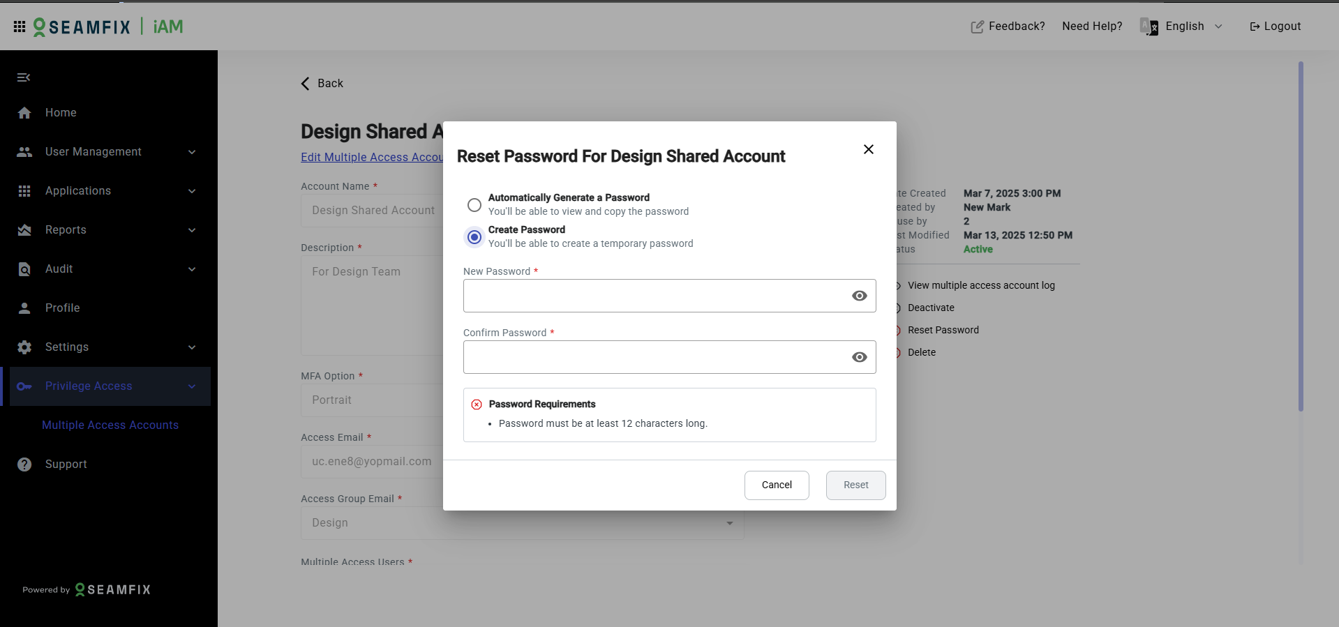 Upon clicking on Reset the new password will be advised to all the Multiple access users for the specified account.