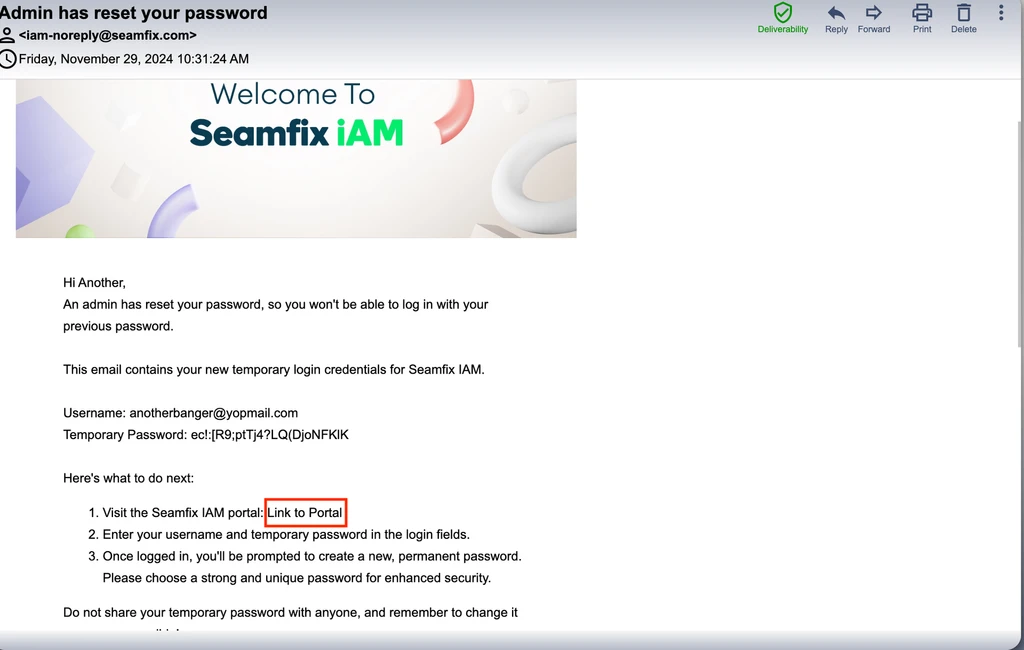 - The email will contain a temporary password, a link to the IAM login page, and instructions for the first login.