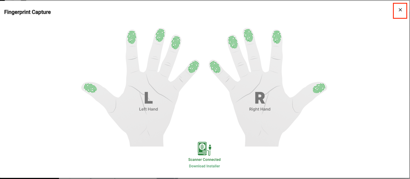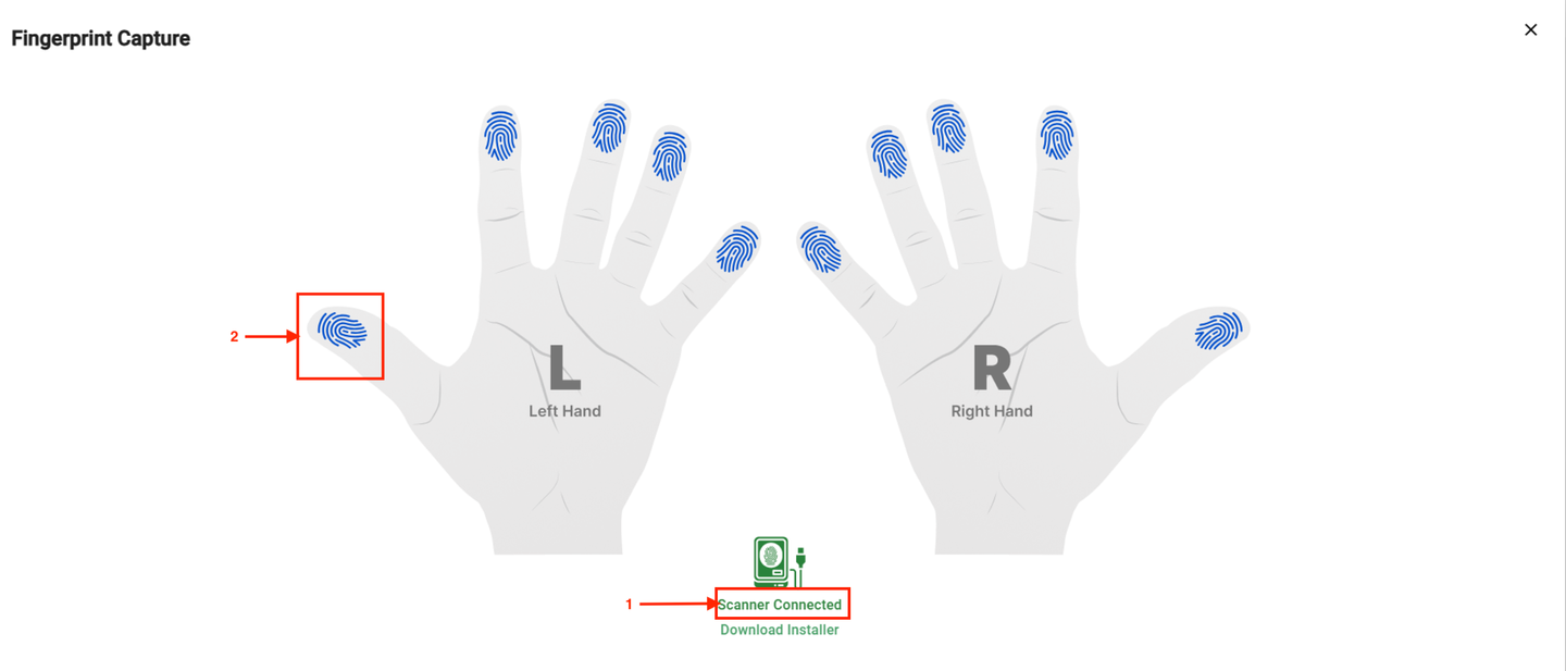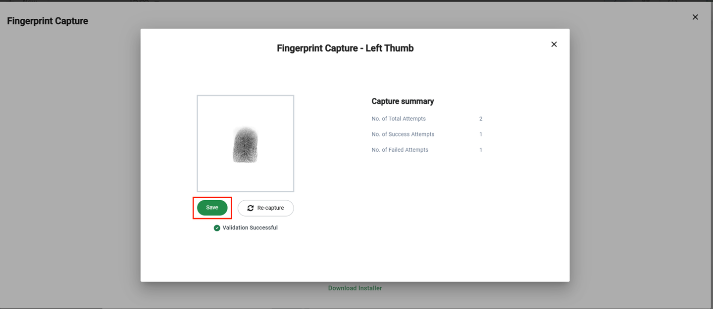 A web component is needed for the fingerprint capture to be successful. click on 'Download Installer' on the screen to download the required web component