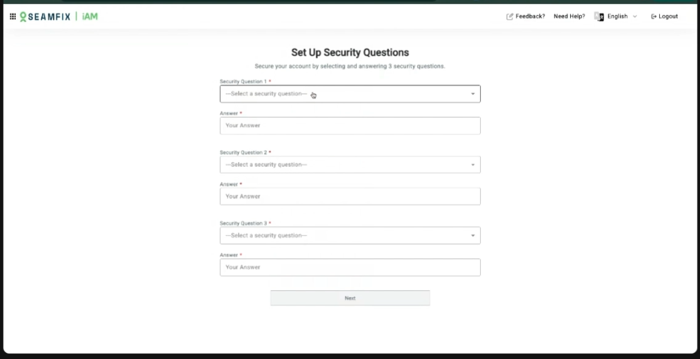 **Setup Security questions: ** The User would be presented a set of security questions to answer and can be updated on their profile once they log in. This is necessary for users without emails as they will be able to provide the answers to the questions to change their password when it is forgotten.