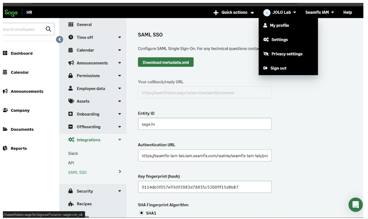 After exporting the metadata from Fixiam, follow these steps to set up the SAML connection in Sage HR: