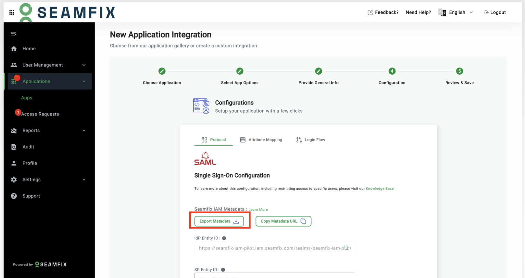 - On the Configuration page, Click Export Metadata