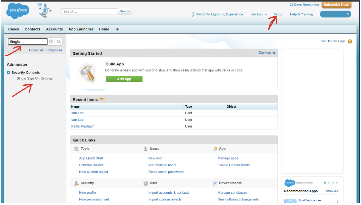 - Go to Setup, then search for “Single Sign-On” in the Quick Find box