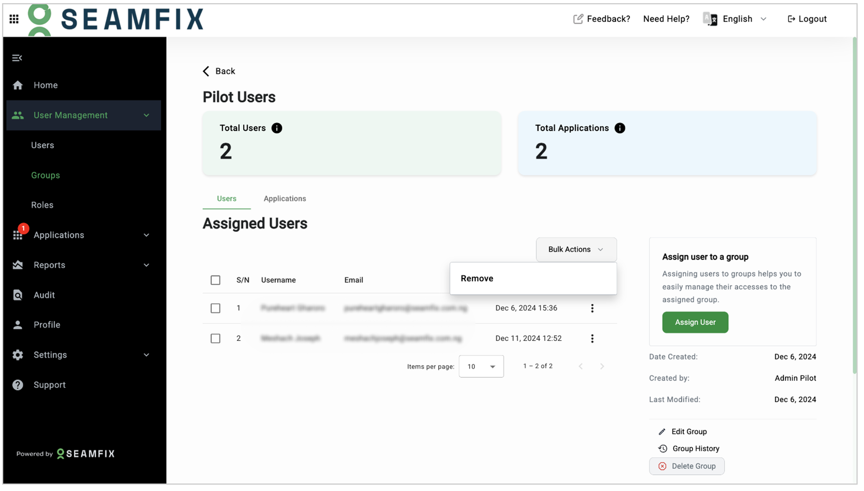Perform bulk actions on selected users/applications (e.g., removing users or applications).